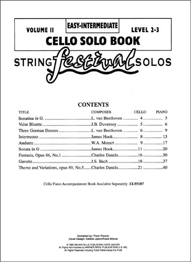 String Festival Solos are economical collections of transcriptions by Samuel Applebaum. In two volumes for each instrument, the solos are in progressive order of difficulty. Each volume contains nine pieces -- all classic titles in the Applebaum teaching repertoire. Some of these have been hard to find. Volume I progresses from Level 1 to Level 2, Volume II progresses from Level 2 to Level 3. The solos are useful for teaching technique, dynamics, phrasing, and overall musicianship. String Festival Solos are excellent for recitals, auditions and performances for assemblies, concerts or festivals. Contains: Sonatina in G (Beethoven) * Valse Bluette (Duvernoy) * Three German Dances (Beethoven) * Intermezzo (Hook) * Andante (Mozart) * Sonata in G (Hook) * Fantasia, Opus 86, No. 1 (Dancla) * Gavotte (Bach) * Theme and Variations, Opus 89, No. 5, (Dancla).