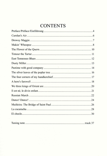Contents include: Carolan's Air • Drowsy Maggie • East Tennessee Blues • We Three Kings of Orient Are • Russian March • La Cucaracha • and more!