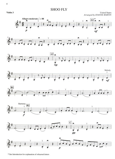 More Folk Strings is a collection of melodies from around the world, in a variety of moods and with rhythmic patterns and harmonies that are representative of their country of origin. Because of the flexible scoring used in More Folk Strings, players at a variety of levels can make music together and less experienced players can play the solo (melody) parts, which use little or no shifting and are in accessible keys. Some pieces in the collection are easier than others. The collection is available in a number of instrumentations for string quartet or string orchestra, for violin ensemble, viola ensemble, cello ensemble, for two, three, or four violin, viola or cello players in any combination of these instruments, and for solo violin, solo viola, and solo cello. The piano accompaniment may be used with any of the combinations. In More Folk Strings for String Quartet or String Orchestra, the melody is passed around so that all members of the ensemble can have the opportunity to play the tune. Score and parts are marked with "melody" and "harmony" to help players bring out the melody at the appropriate moment. Teachers' notes provide lyrics and background information on each folk song in addition to rehearsal and performance suggestions.