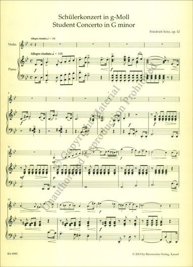 Friedrich Seitz (1848-1918) was one of the best-known and most sought-after violinists of his day. This concerto starts with a resolute allegro in G minor, followed by a gentle adagio in E-flat major and flows into a cheerful dance-like final movement in G major. In order to play this, violinists must be able to master 1st to 3rd positions.