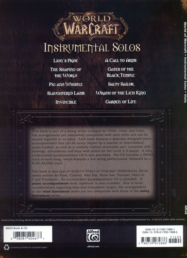This instrumental series contains themes from Blizzard Entertainment's fantasy, multiplayer, role-playing, video games and includes 4 pages of art from the World of Warcraft universe. The compatible arrangements are carefully edited for the Level 2-3 player and include an accompaniment CD which features a demo track and play-along track. Titles: Lion?s Pride * The Shaping of the World * Pig and Whistle * Slaughtered Lamb * Invincible * A Call to Arms * Gates of the Black Temple * Salty Sailor * Wrath of the Lich King * Garden of Life. " . . . fun and catchy, even for students who have never set (virtual) foot in the Warcraft universe. The violin part is easily playable by a middle or high school student. All notes fit within first position, and key signatures are never harder than A major." ?Strings magazine