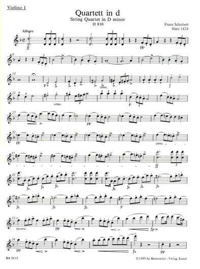 A Bärenreiter Urtext edition of Schubert's String Quartet in D minor: Death and the Maiden for two violins, viola and cello.