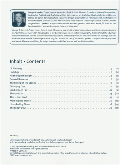 This collection contains many well-known pieces from the Anglo-American world which are catchy and of a dance-like quality. Some melodies are lively, some dreamy but all are easy on the ear. Both violinists are of equal importance and the melody moves frequently from one player to another. When the player takes on the accompanying role, he occasionally has to substitute the guitar and must play arpeggios and easy double stops. The melody part contains embellishments typical of the style.
