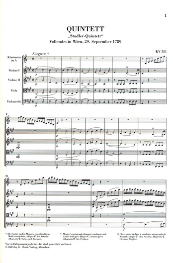 A G. Henle Verlag Urtext Student Edition Study Score of Mozart's Clarinet Quintet KV 581 for clarinet in A, two violins, viola and cello; and Mozart's Clarinet Quintet KV Anh. 91 for clarinet in B, two violins, viola and cello.