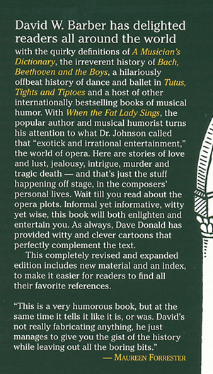 David W. Barber, the popular author and musical humorist turns his attention to what Dr. Johnson called that "exotick and irrational entertainment," the world of opera. Here are stories of love and lust, jealousy, intrigue, murder and tragic death - and that's just the stuff happening off stage, in the composers' personal lives. Wait till you read about the opera plots. Informal yet informative, witty yet wise, this book will both enlighten and entertain you. As always, Dave Donald has provided witty and clever cartoons that perfectly complement the text.