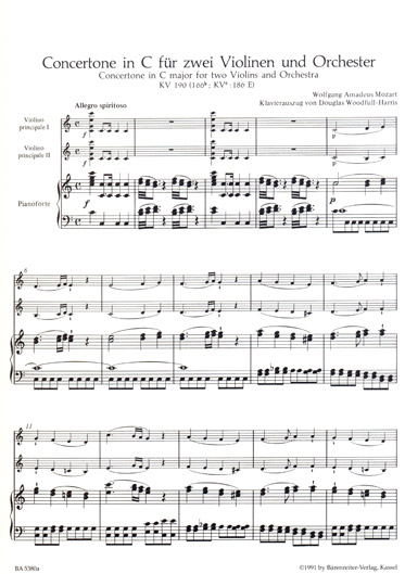 Concertone in C major, k. 190 for two violins with a piano reduction by Douglas Woodfull-Harris.