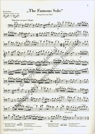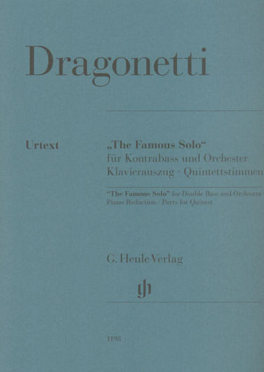 It is a bit of a paradox: one of Dragonetti's favourite pieces and also his showpiece, "The Famous Solo", originally for double bass and orchestra, is largely unknown today. This cannot be down to the virtuoso work itself, but is more likely due to the unclear source situation with its different versions. In this edition Tobias Glöckler presents Dragonetti's autograph arrangement for double bass and string quartet for the first time. For those who would like to study the orchestral version, there is also a piano reduction, based on a contemporary model. Using this edition, the "Famous Solo" can be performed as needed in the solo and orchestral tuning - piano scores and quartet parts in e minor and f sharp minor are also included.