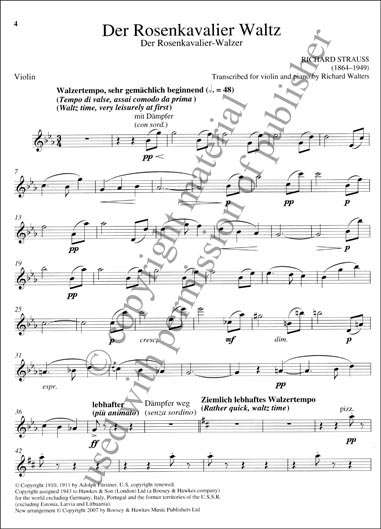 This waltz, as adapted for violin and piano, is from the end of Act 2 of the opera. The composer adapted a Waltz Sequence (no. 1), from Acts 1-2, from Der Rosenkavalier for orchestra in 1925. Strauss adapted the Waltz Squence (no. 2), from Act 3, from Der Rosenkavalier for orchestra in 1934.