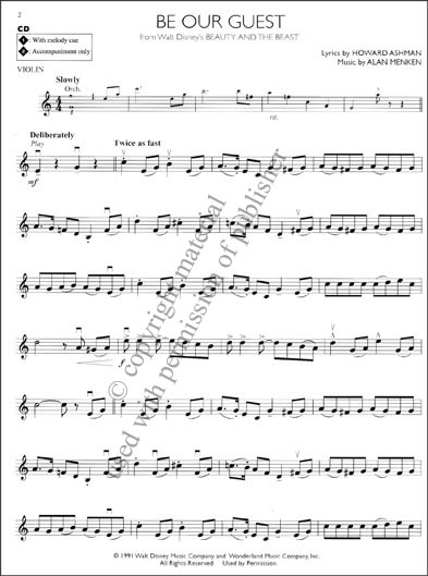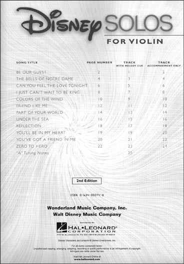 Popular Disney songs arranged for solo violin with CD accompaniment; intermediate level.